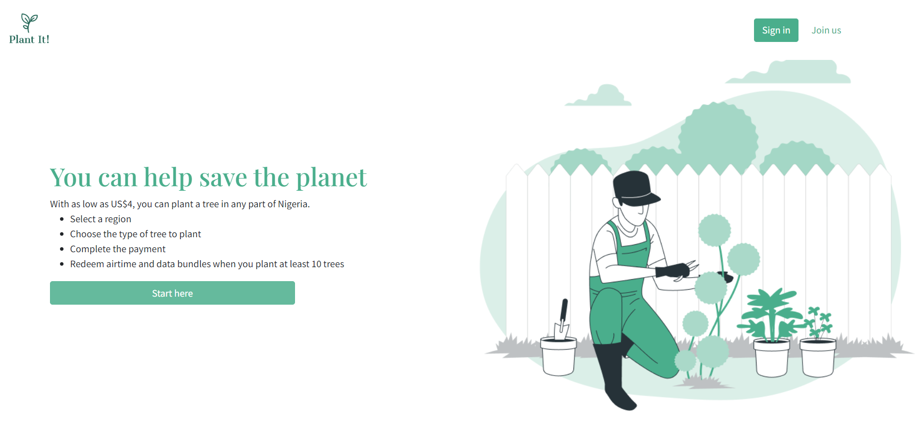 Planting of trees has been said to tackle deforestation, desertification, and absorb harmful carbon from the atmosphere. In line with SDG 13 (Climate action) which says “Take urgent action to combat climate change and its impacts, the app is designed to promote, and encourage positive climate actions among users from the comfort of their homes and devices, by providing them with a means to plant trees and get more engaged with such activities without them physically being involved. While users donate to plant trees, a token of their money is converted to points, after a considerable amount of time, users are able to convert their points into Airtime, Gift cards or Data.